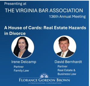 FGB Partners, Irene Delcamp and David Bernhardt, will speak at the 136th Virginia Bar Association Annual Meeting on “Real Estate Hazards in Divorce”. Ms. Delcamp practices with the firm’s family law team, and Mr. David Bernhardt practices real estate and business law. Irene’s husband, Joe Duda with The Loan Advisors, will also be presenting.